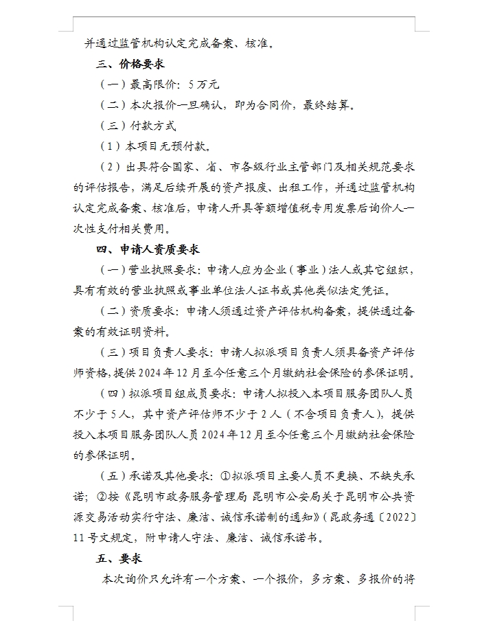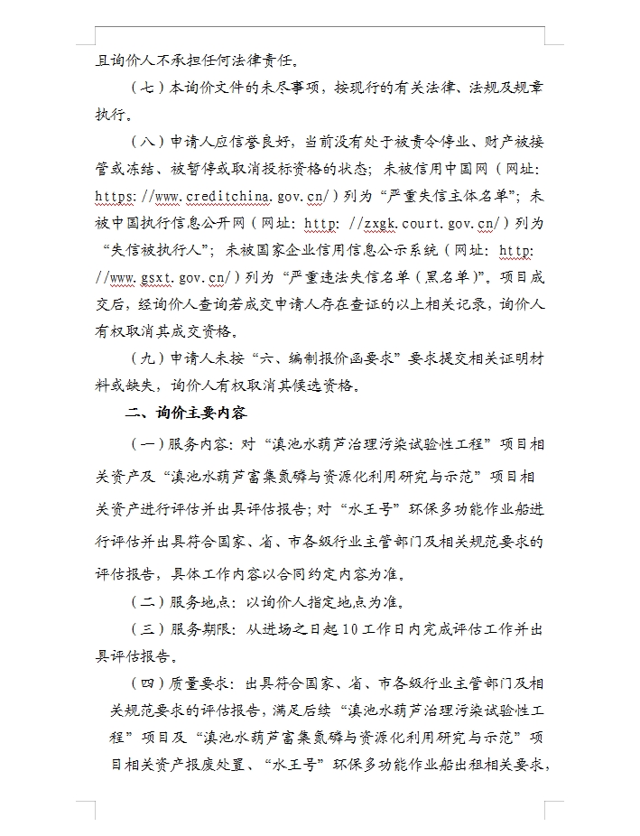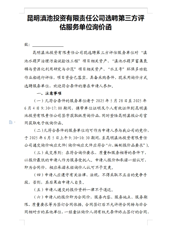 昆明滇池投資有限責(zé)任公司選聘第三方評(píng)估服務(wù)單位詢價(jià)函