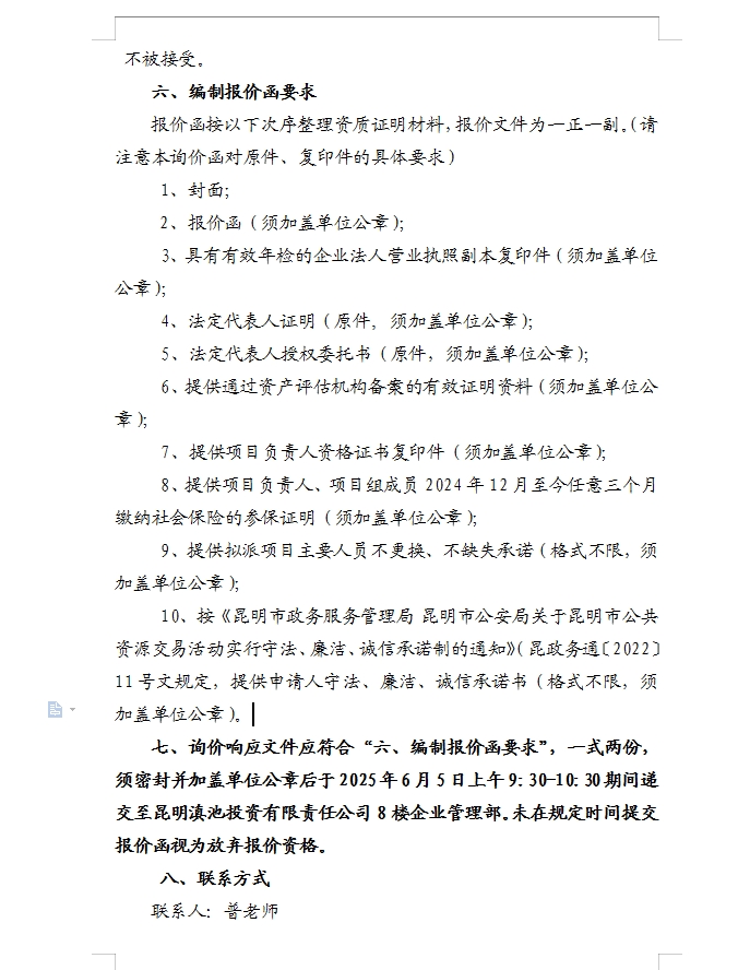 首頁>信息公開>昆明滇池投資有限責(zé)任公司選聘第三方評(píng)估服務(wù)單位詢價(jià)函