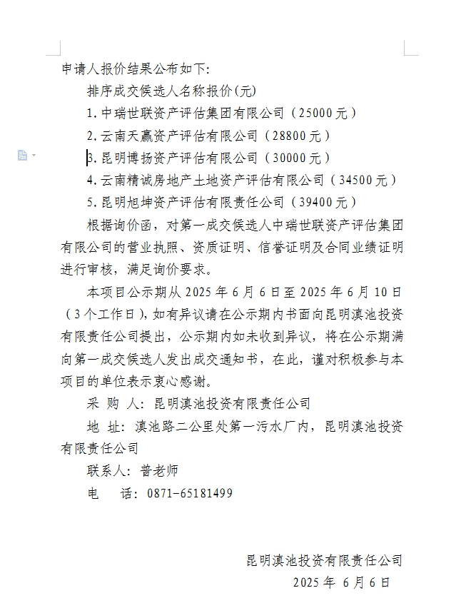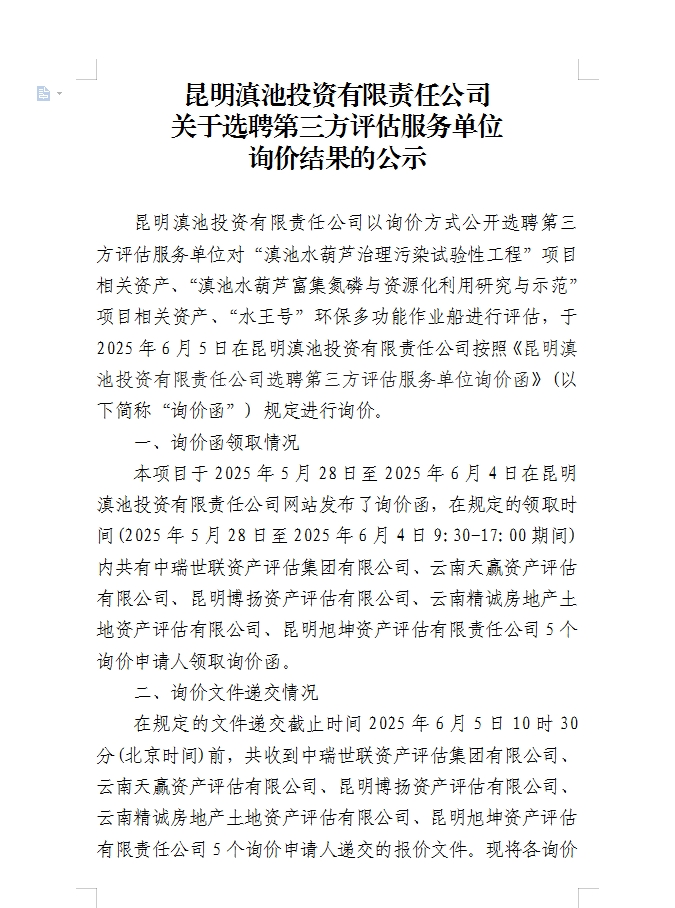 昆明滇池投資有限責任公司關于選聘第三方評估服務單位詢價結果的公示