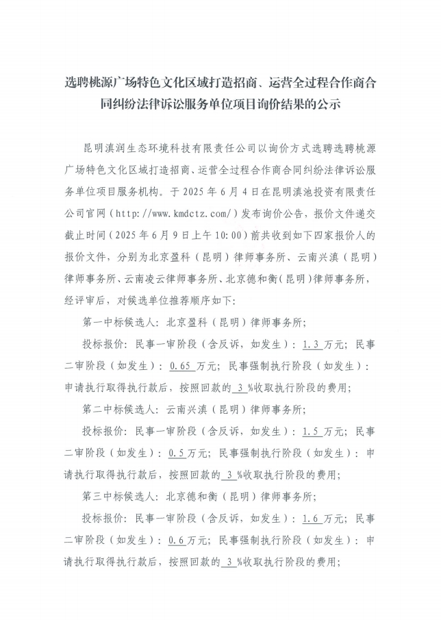 >選聘桃源廣場特色文化區(qū)域打造招商、運營全過程合作商合同糾紛法律訴訟服務單位項目詢價結果的公示