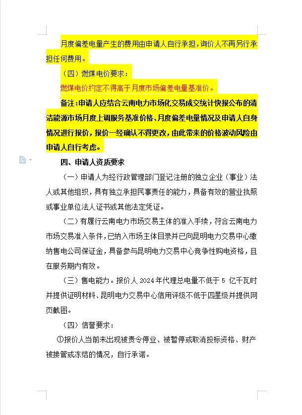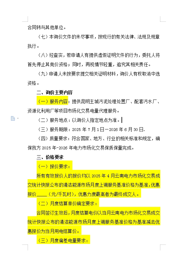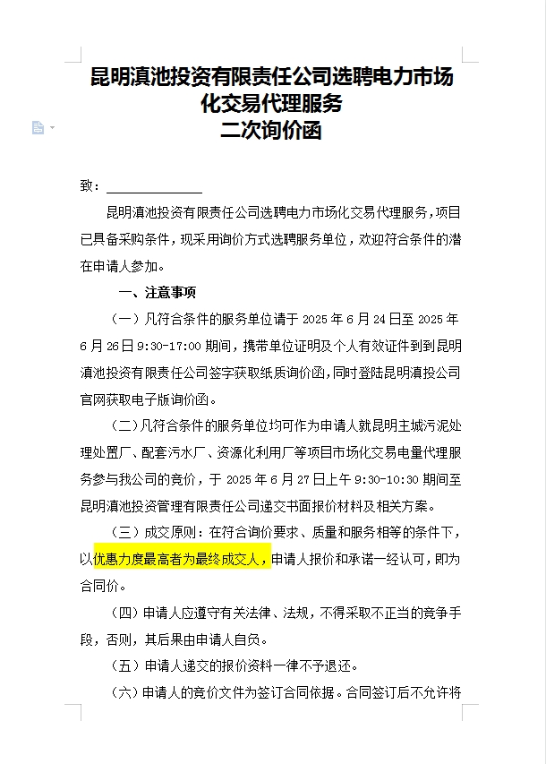 >昆明滇池投資有限責任公司選聘電力市場化交易代理服務二次詢價函
