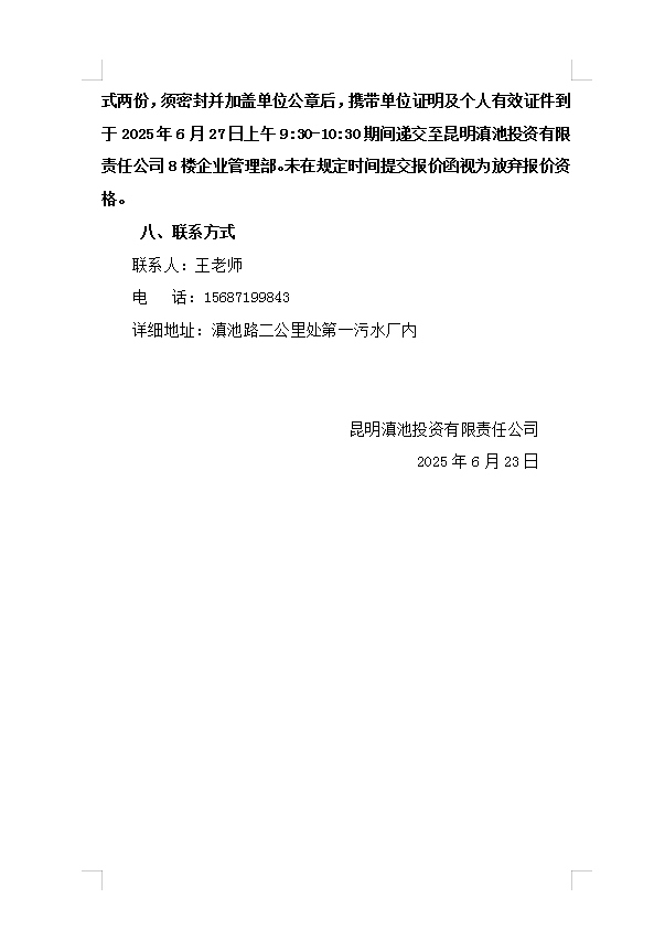 昆明滇池投資有限責任公司選聘電力市場化交易代理服務二次詢價函