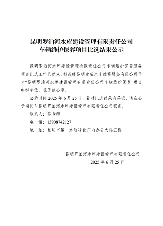 昆明羅泊河水庫建設(shè)管理有限責(zé)任公司車輛維護保養(yǎng)項目比選結(jié)果公示