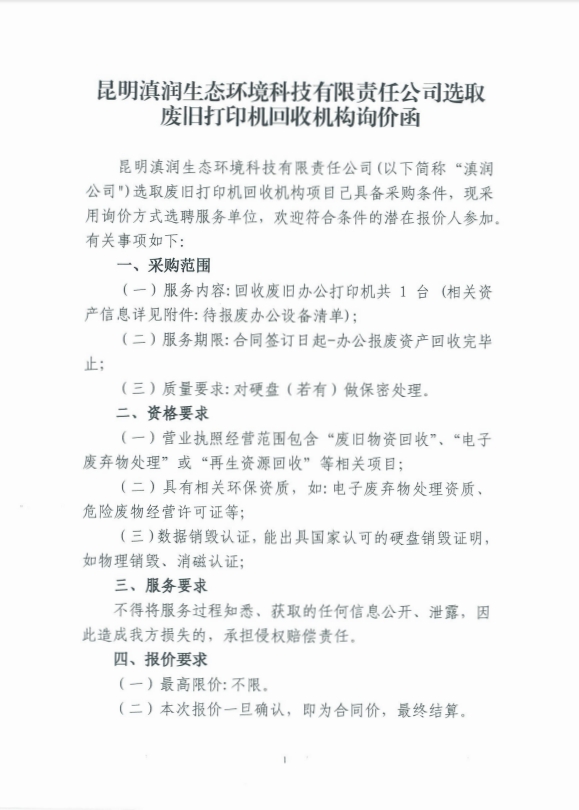 首頁>信息公開>昆明滇潤生態(tài)環(huán)境科技有限責任公司選取廢舊打印機回收機構詢價函