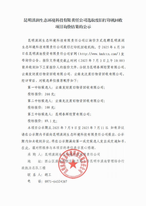 昆明滇潤生態(tài)環(huán)境科技有限責(zé)任公司選取廢舊打印機回收項目詢價結(jié)果的公示