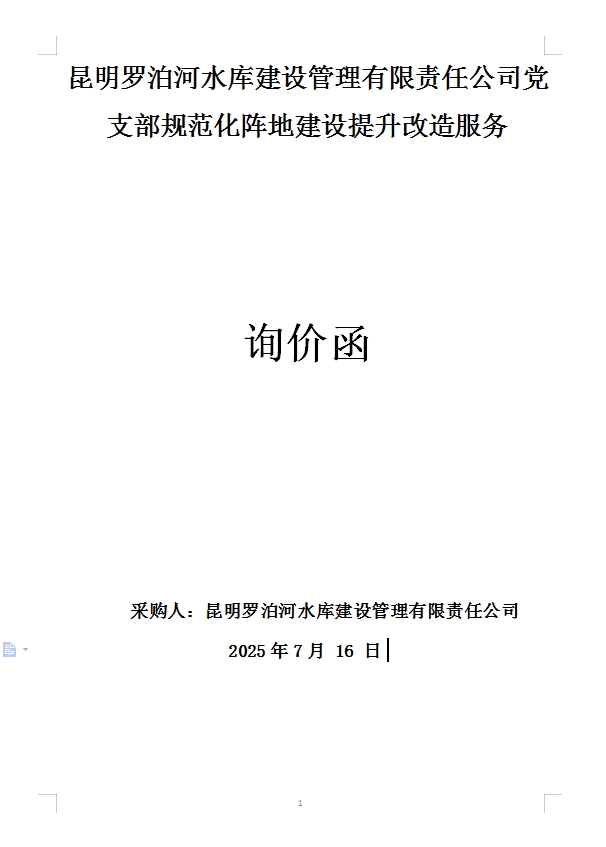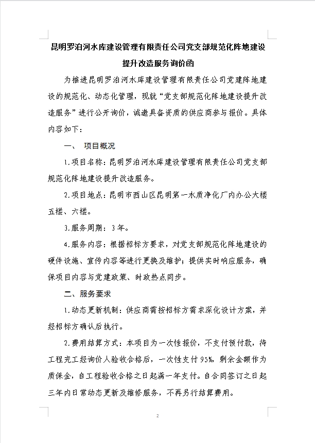 昆明羅泊河水庫(kù)建設(shè)管理有限責(zé)任公司黨支部規(guī)范化陣地建設(shè)提升改造服務(wù)詢價(jià)函