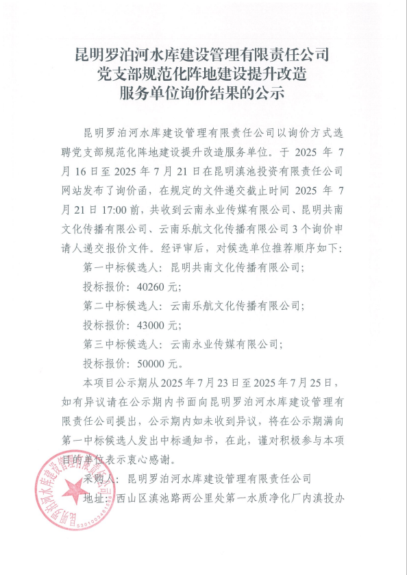 昆明羅泊河水庫建設(shè)管理有限責(zé)任公司黨支部規(guī)范化陣地建設(shè)提升改造服務(wù)單位詢價(jià)結(jié)果的公示