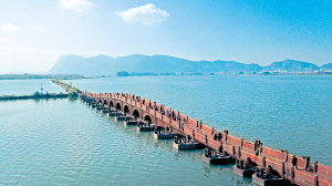 東風壩整治修復工程位于滇池草海北片區(qū),北接新運糧河旁的環(huán)滇池綠道,西通高峣立交王家堆濕地。工程道路全長3450米,步道寬2米至4米。其中,七孔浮橋長130米,橋面寬3.6米,結構為鋼結構,設計取意源于昆明古八景之一的“云津夜市”,靈感來自昆明??诖ㄗ珠l橋墩,保留了古典橋梁的美感。連接七孔浮橋與環(huán)滇池綠道的生態(tài)走廊,新建照明和監(jiān)控系統(tǒng),沿線設置避雨亭、景觀石、石籠坐凳和木樁坐凳等便民設施,提升了景觀效果,方便游客休閑觀光。
