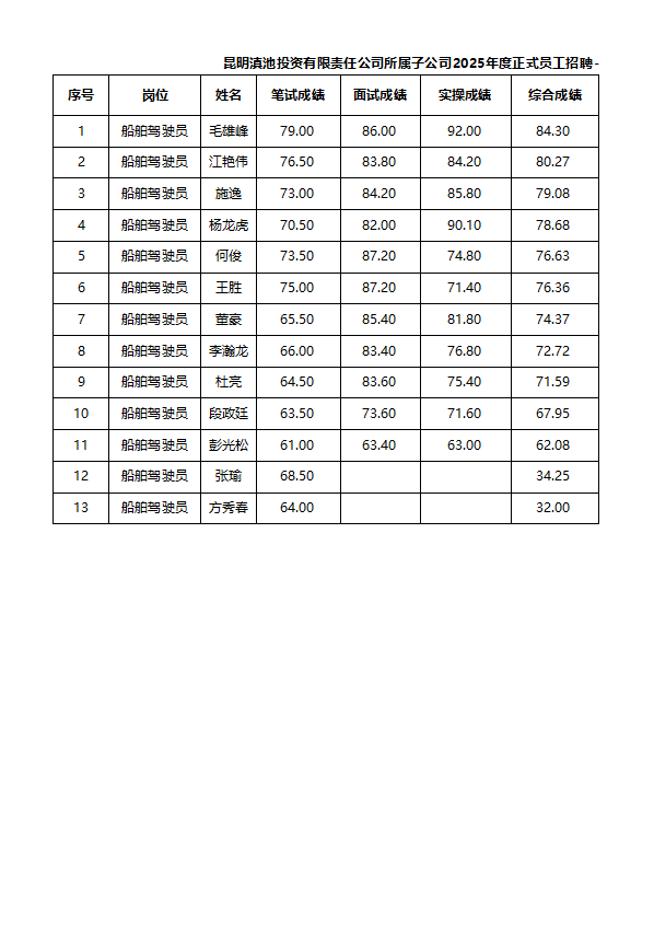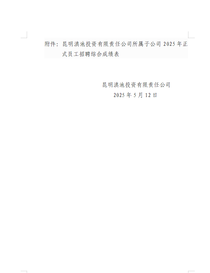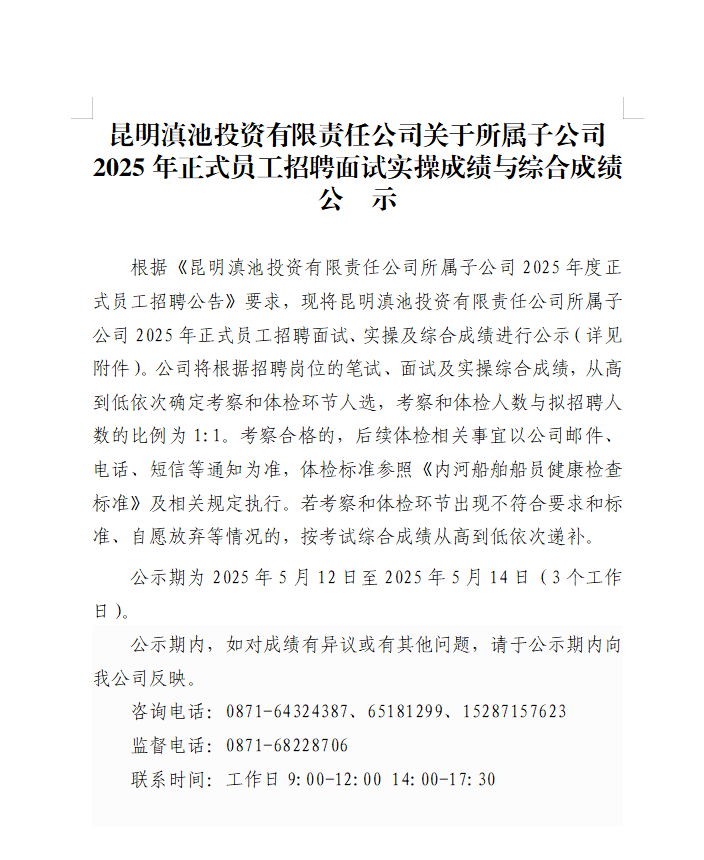 昆明滇池投資有限責(zé)任公司關(guān)于所屬子公司2025年正式員工招聘面試實(shí)操成績與綜合成績公??示
